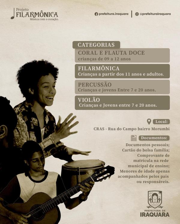 Mmunicipal de Iraquara através da Secretaria Municipal de Desenvolvimento e Apoio Social, com o intuito de promover assistência social através do desenvolvimento de oportunidades e habilidades, comunica toda a população que estará desenvolvendo um projeto musical que atenderá crianças e jovens que estão matriculados regularmente na rede municipal de ensino e beneficiários do Programa Bolsa Família.